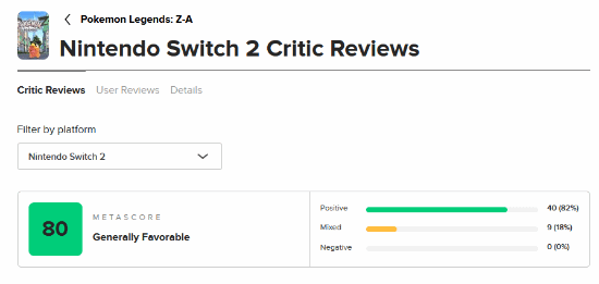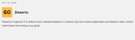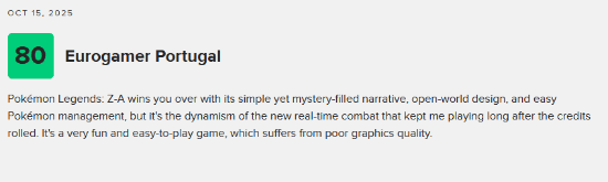 今天(10月16日),备受期待的游戏《宝可梦传说:Z-A》终于正式发售。随着媒体评分的全面解禁,M站的评分目前定格在80分,开分时更是达到了81分。